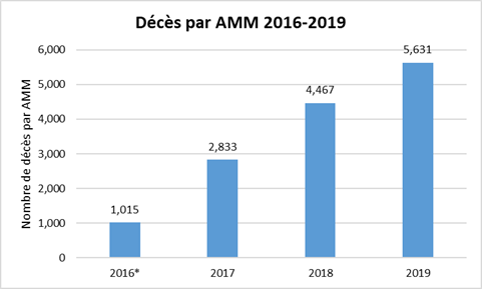 - En 2019, il y a eu 5 631 cas d’AMM, représentant 2 % de tous les décès au Canada cette année-là. Dans d’autres administrations permettant l’AMM, ce pourcentage varie entre 0,3 % et 4,6 % de tous les décès.